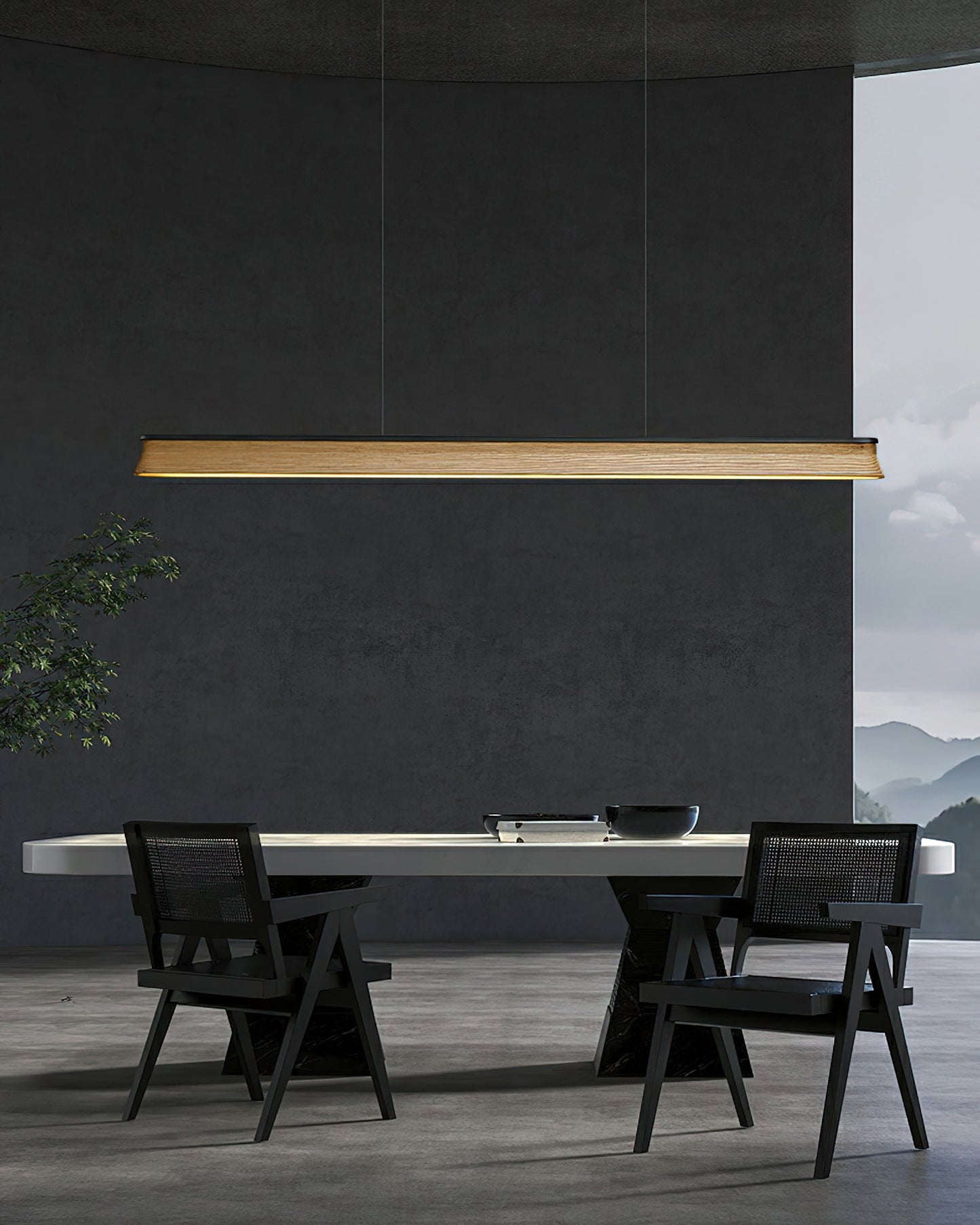 Introducing the Danqiu Chandelier - the perfect lighting fixture for modern interiors. Its sleek, minimalist design features a streamlined wooden beam, creating a warm and elegant atmosphere. With a floating effect, this pendant lamp is perfect for clean and unobtrusive lighting in dining areas, kitchens, and offices. The soft, diffused light provides even illumination, ensuring a comfortable and stylish space.