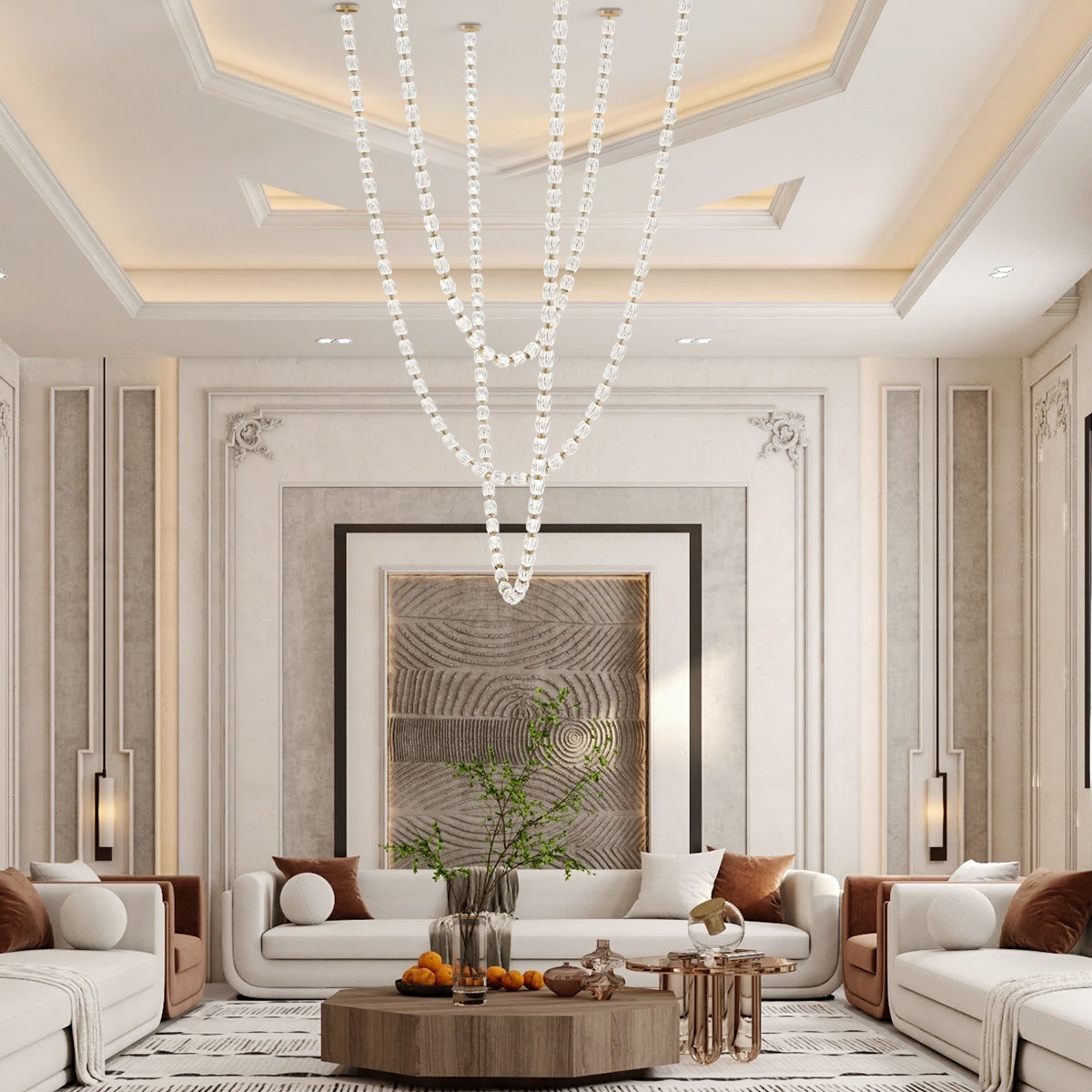 The Modern Crystal Bead Chandelier combines shimmering crystal beads with a polished chrome finish, bringing elegance and luxury to large interiors. Its bold multi-size design creates a striking focal point.