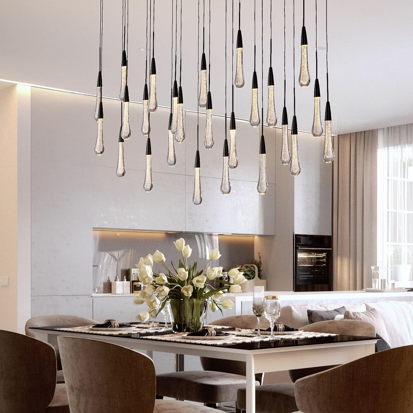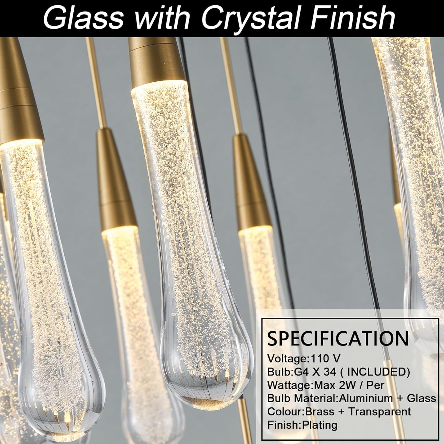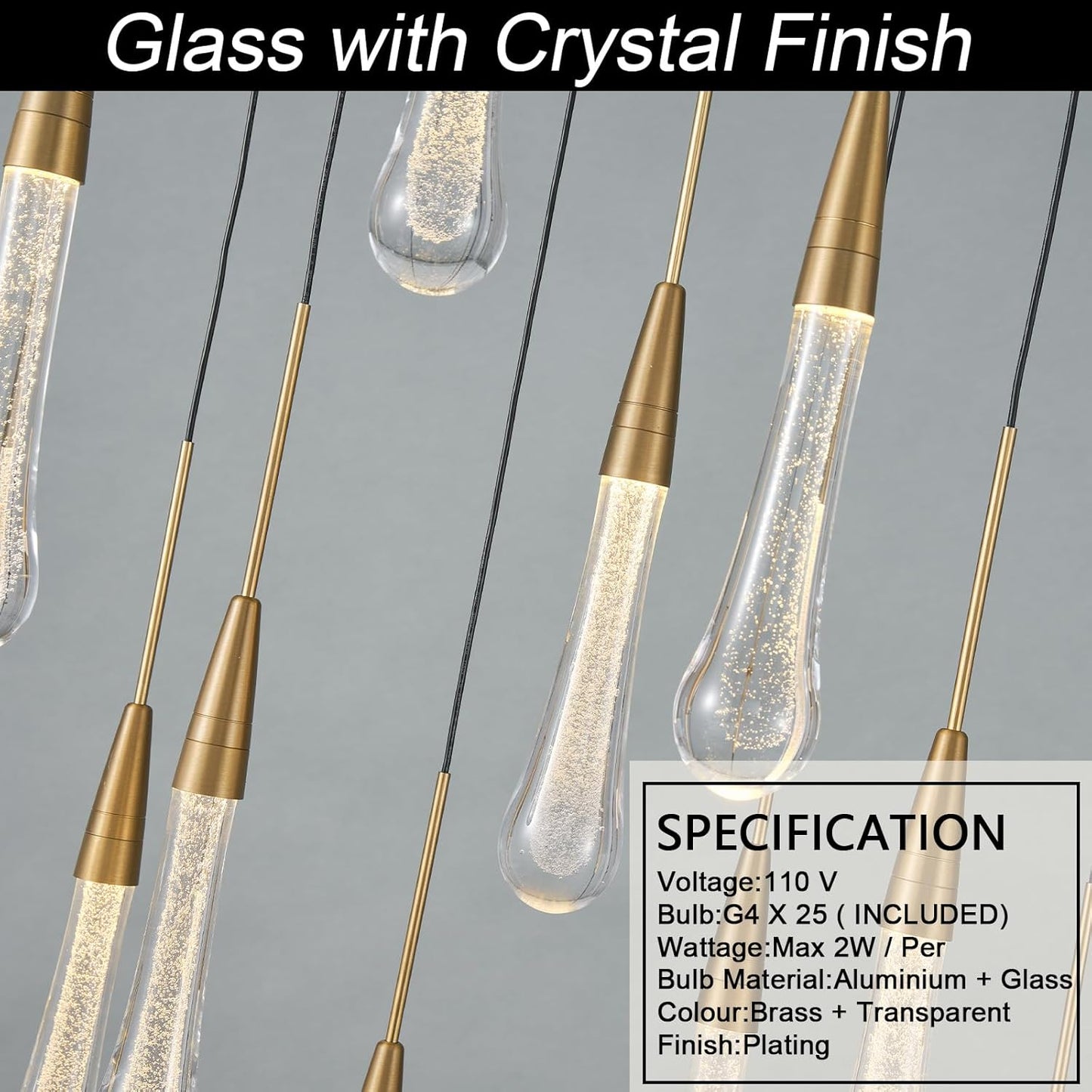 Made of premium glass and polished metal, the chandelier combines durability with luxury. Each glass drop enhances light refraction for a radiant effect.