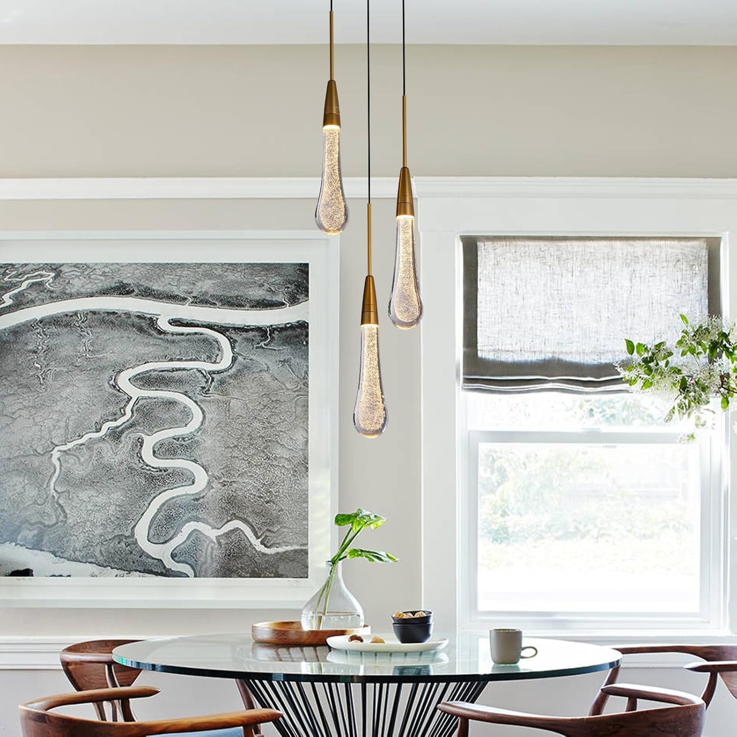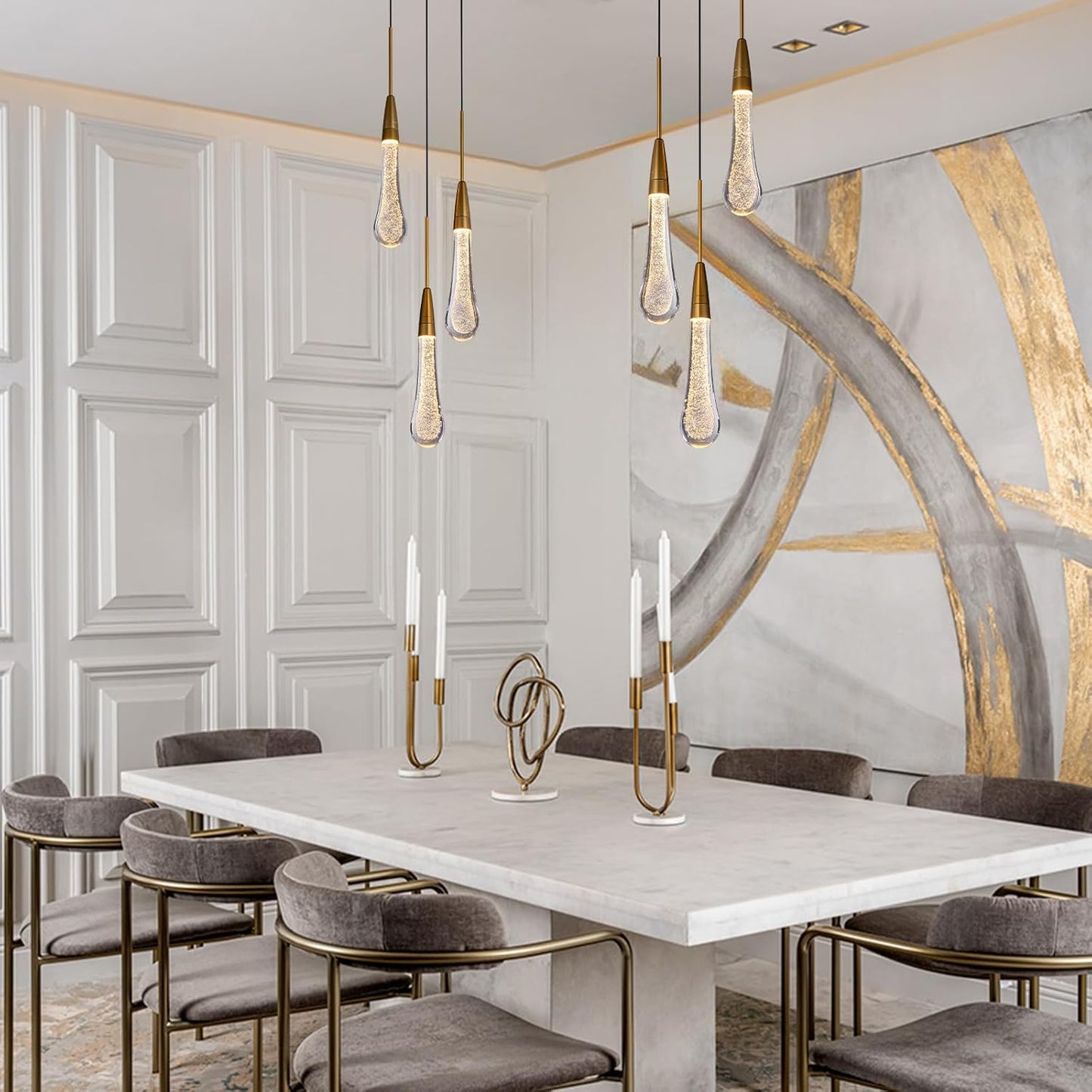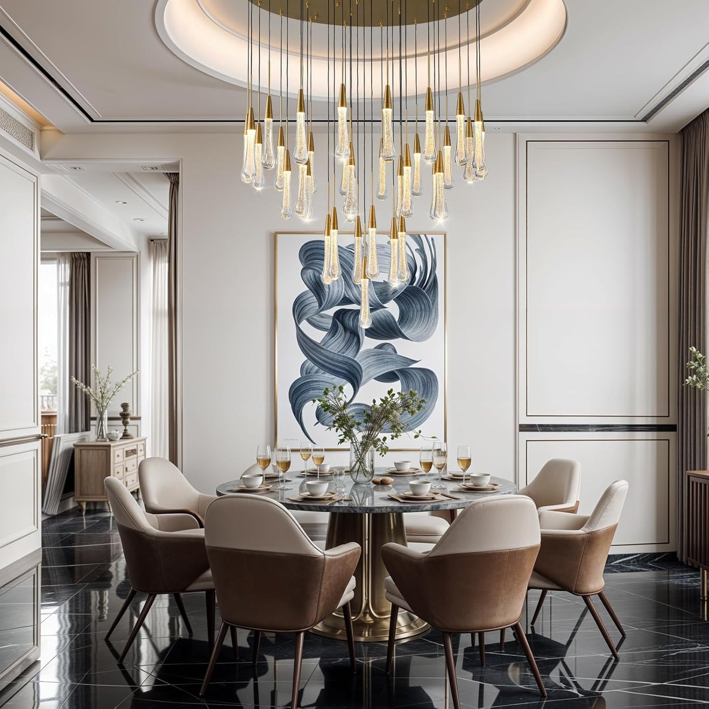 Made of premium glass and polished metal, the chandelier combines durability with luxury. Each glass drop enhances light refraction for a radiant effect.