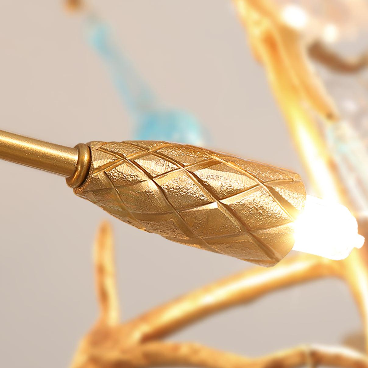 The Bijou collection imitates the sheer power and mystique of nature. Capturing every angle and random movement of branches on a tree, this series offers pure delight to the senses. The realistic branch castings are finished in hand-applied brass adorned with blown crystal drops of various neutral hues.