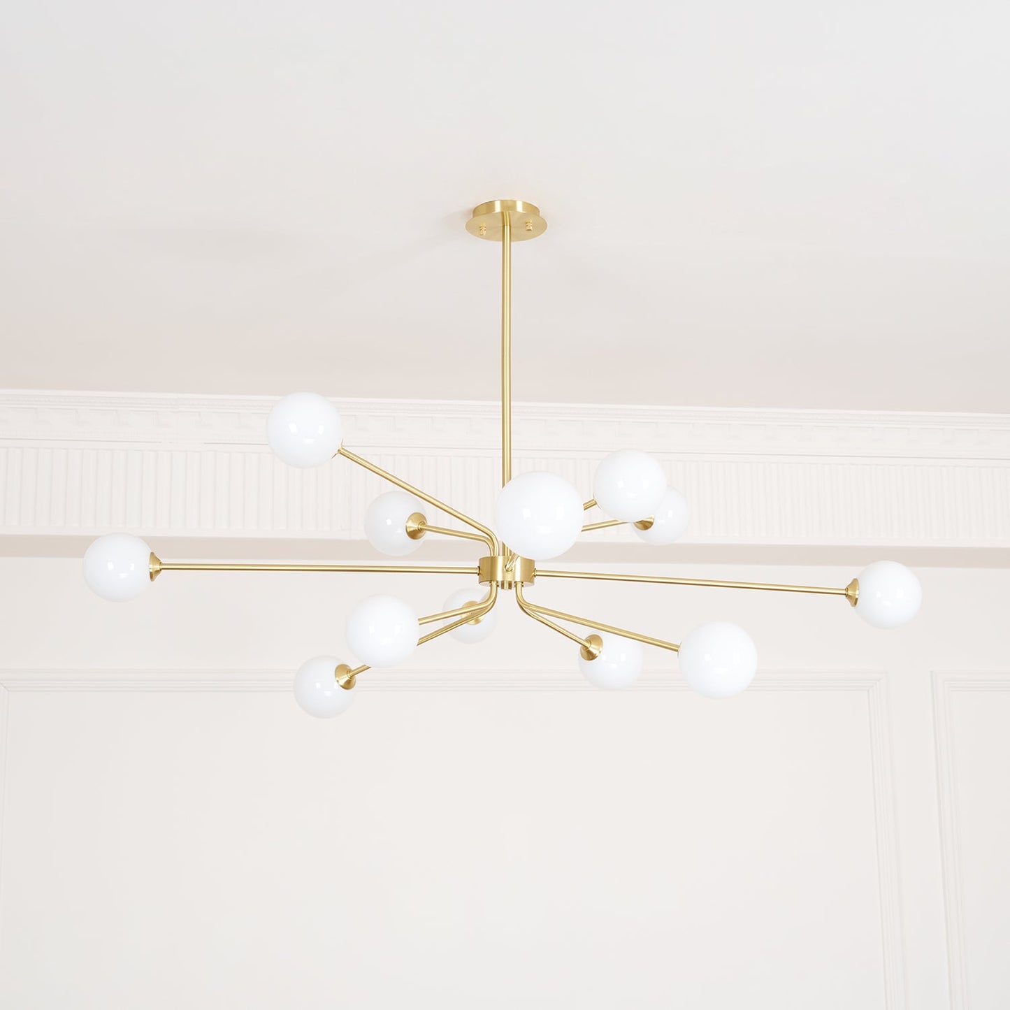Elegance, style, sophistication. The Solaire Arm Chandelier will get all the compliments no matter where you hang it. The smooth White Glass globes, refined brass arms and delicate structure make for a pretty beautiful light.