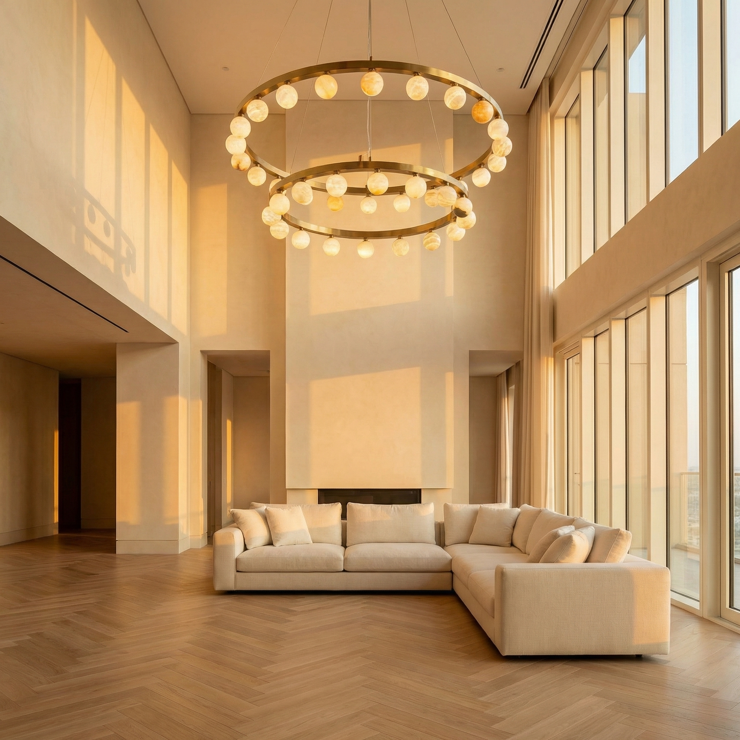 Part of the Orbita Collection, this chandelier combines natural stone with refined metalwork. Each alabaster element is cut from a single stone block, so no two pieces are identical — the veining, translucency, and mineral tone are unique to every fixture.