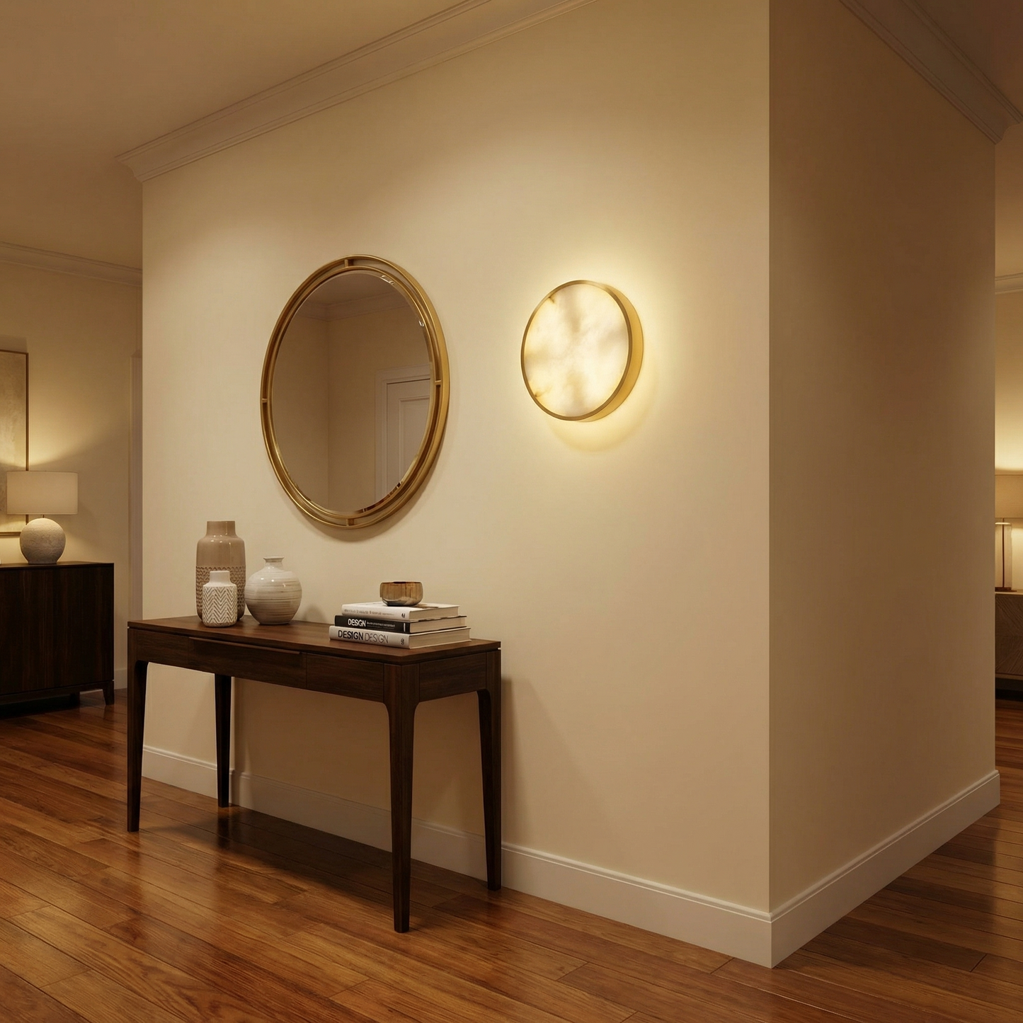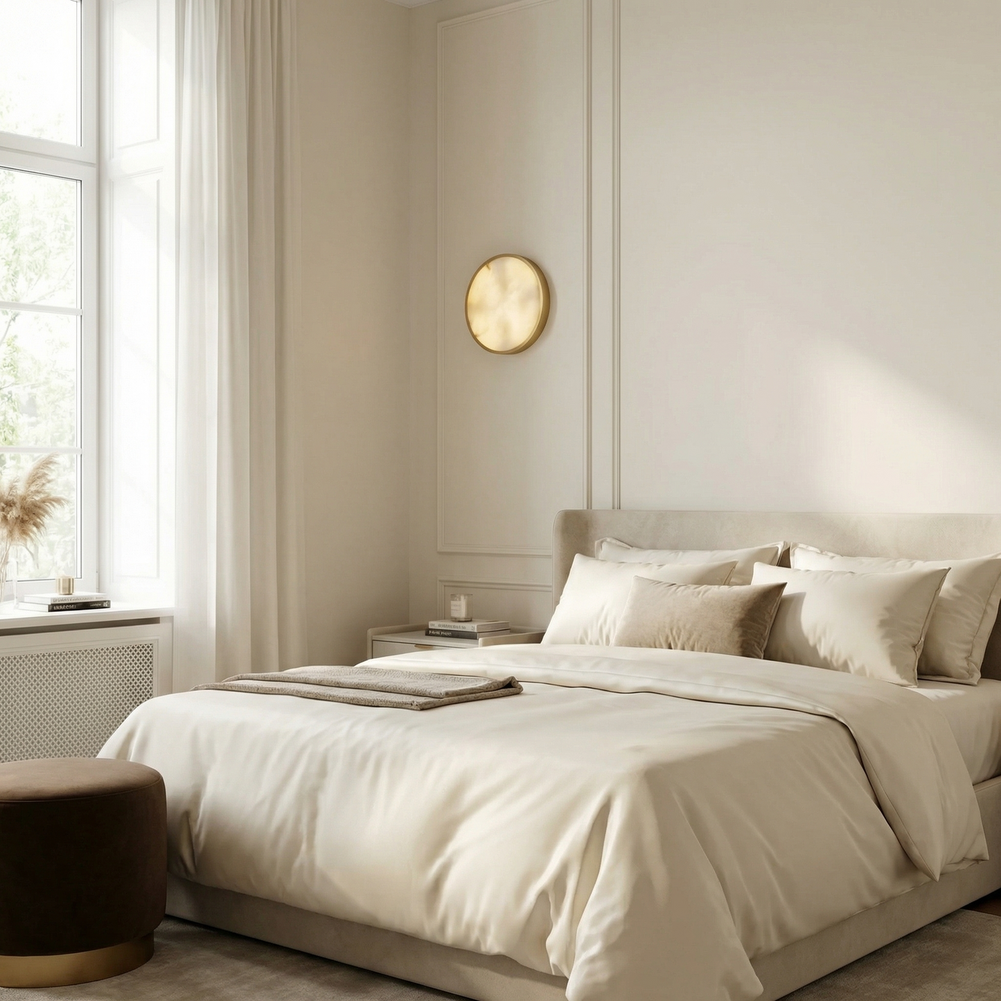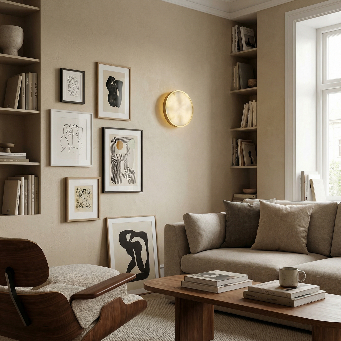 Part of the Luna Disc Collection, this flush-mount wall sconce captures the full moon in translucent alabaster — a flat disc of hand-selected stone that glows with a soft, even amber light, anchored by a minimal metal centre.