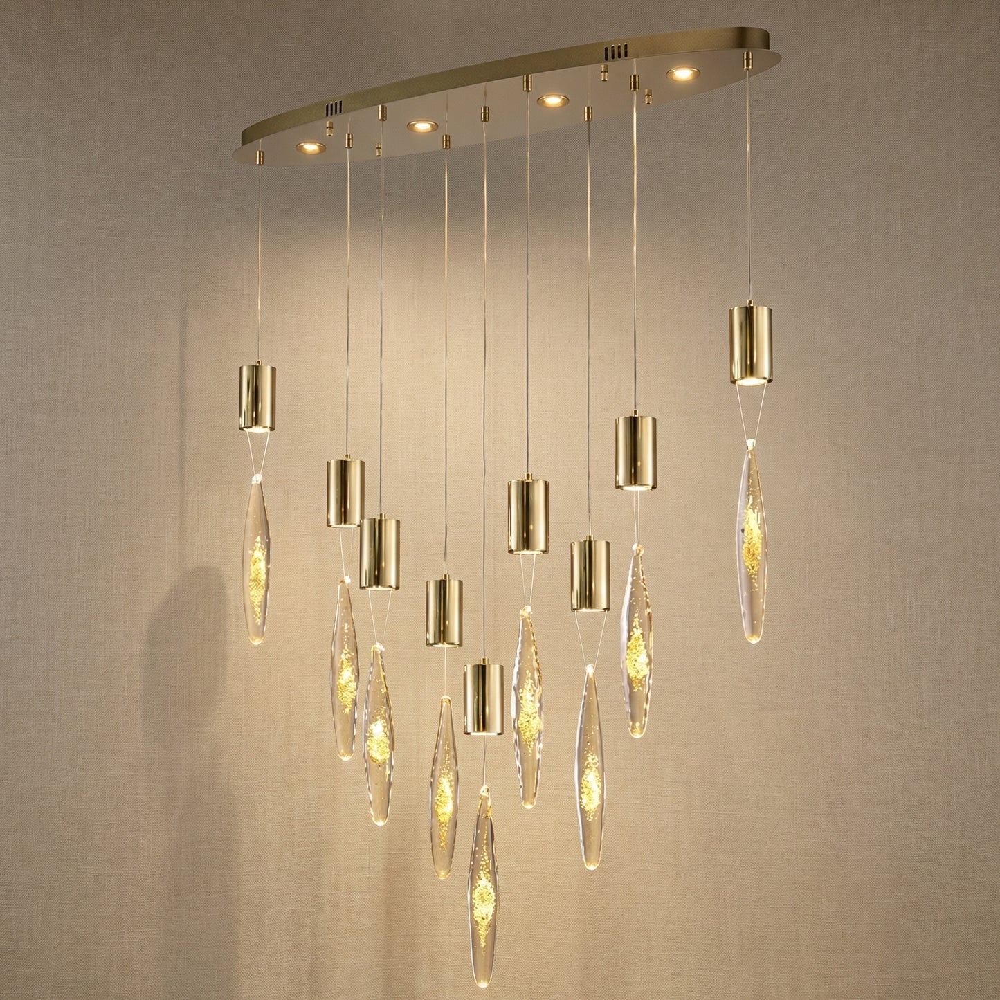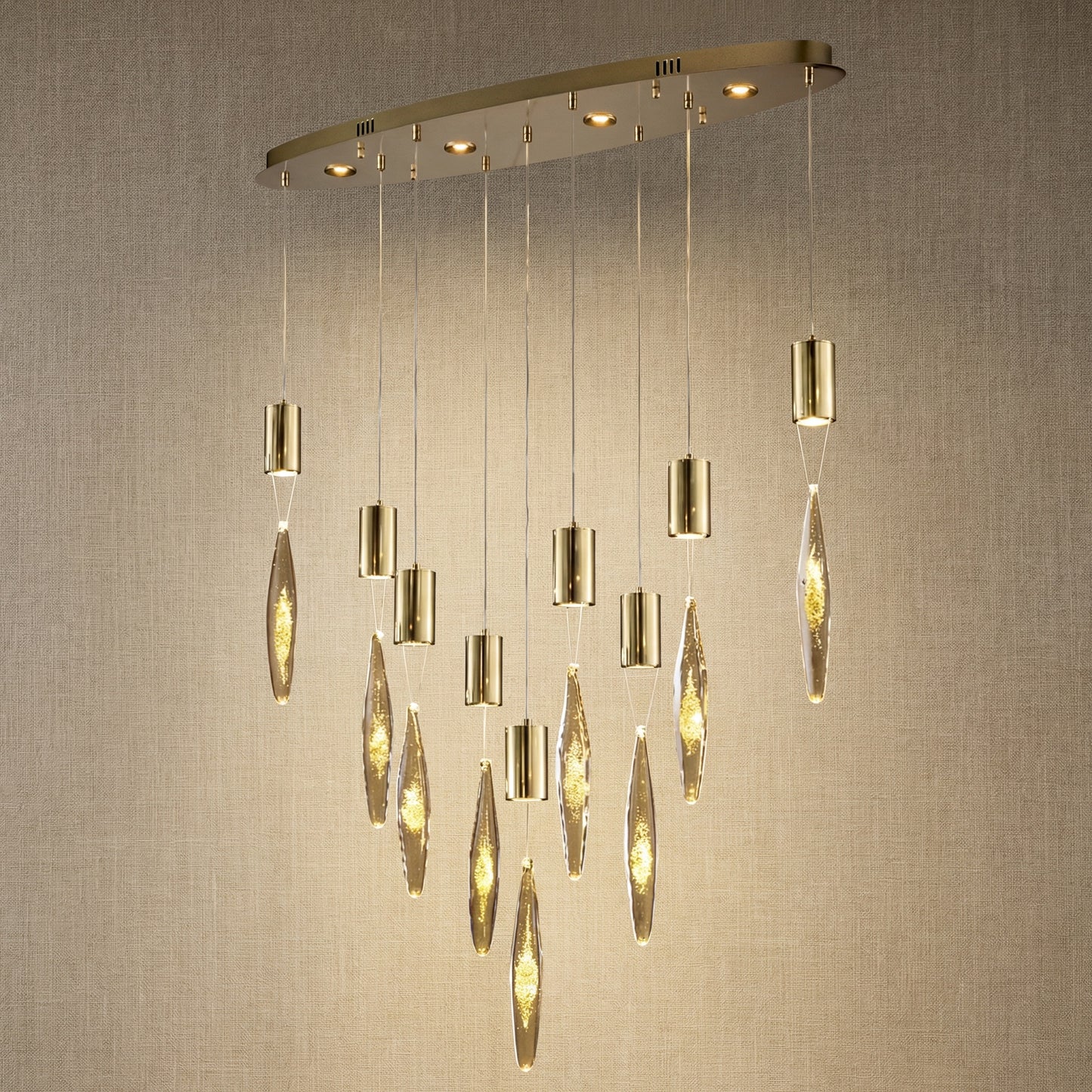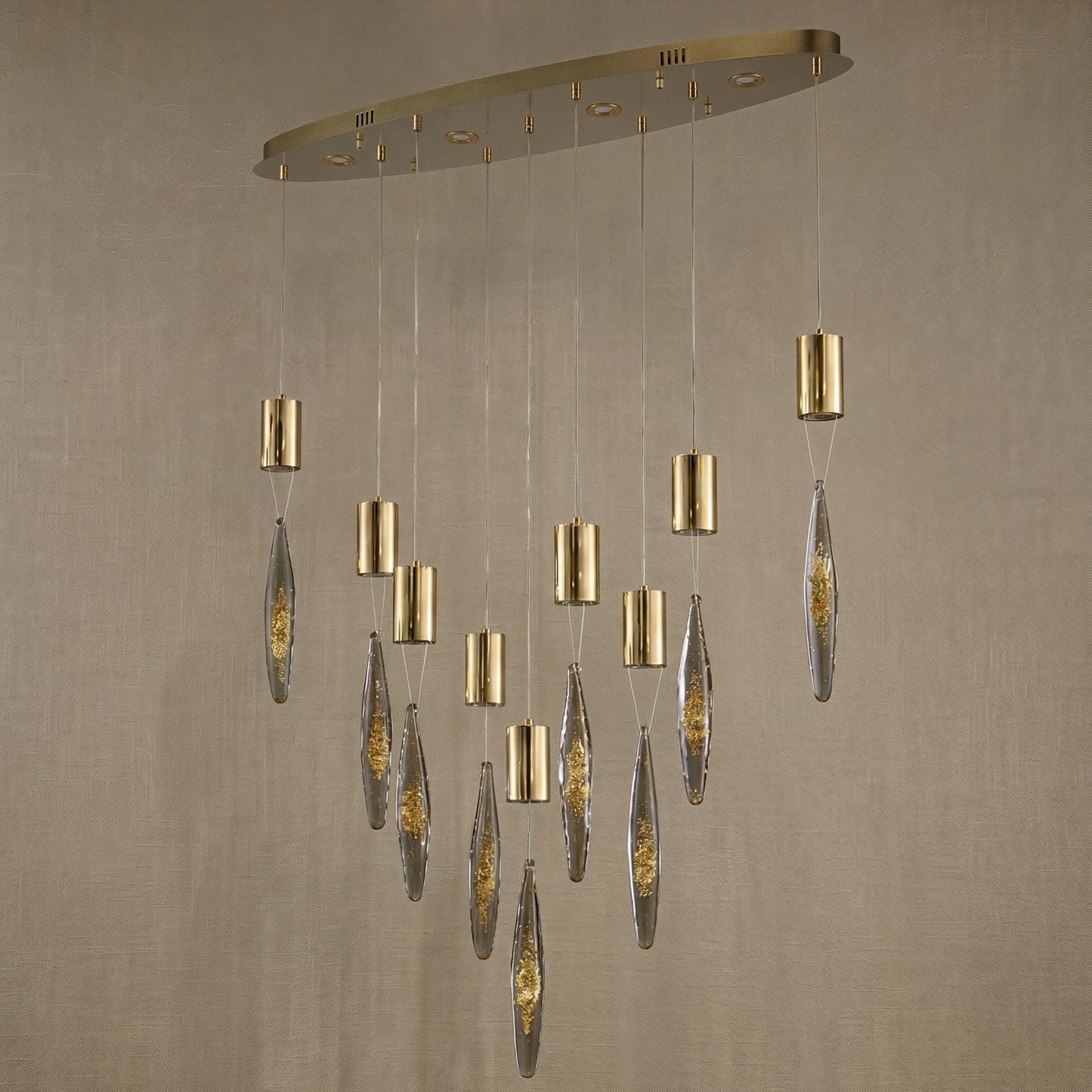 Elevate your space with the Yiosi Series Oval Glass Pendant Light 39" Style D, a masterfully crafted pendant lamp featuring stainless steel, aluminium, glass with gold foil construction with a champagne gold finish. Each piece combines modern elegance with expert craftsmanship, creating a stunning focal point for any room.