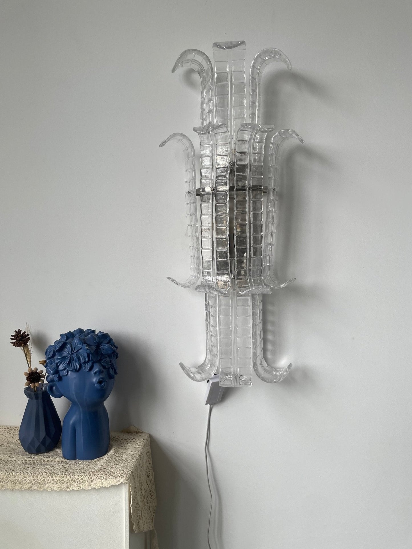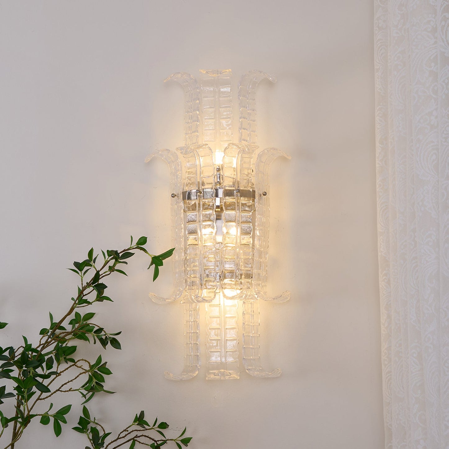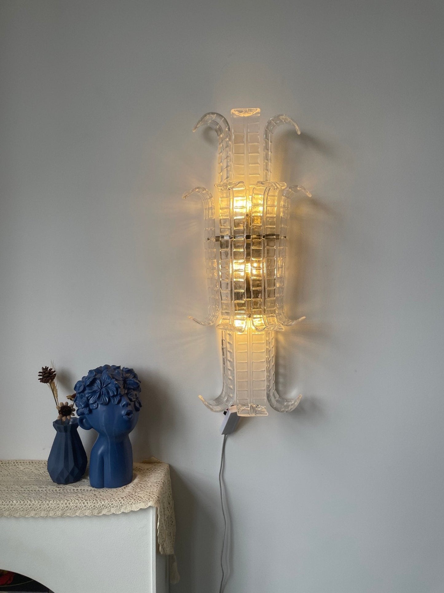 The Aveline Murano Glass Wall Sconce is a breathtaking piece of art, combining delicate craftsmanship with timeless design. Featuring hand-blown Murano glass panels intricately arranged to create a captivating silhouette, this wall sconce radiates a soft, ambient glow. The textured glass, supported by a sleek metallic frame, reflects light beautifully, adding a touch of elegance to any room. Perfect for hallways, living rooms, or bedrooms, the Aveline wall sconce is ideal for creating a sophisticated and luxurious atmosphere in both modern and classic interiors.