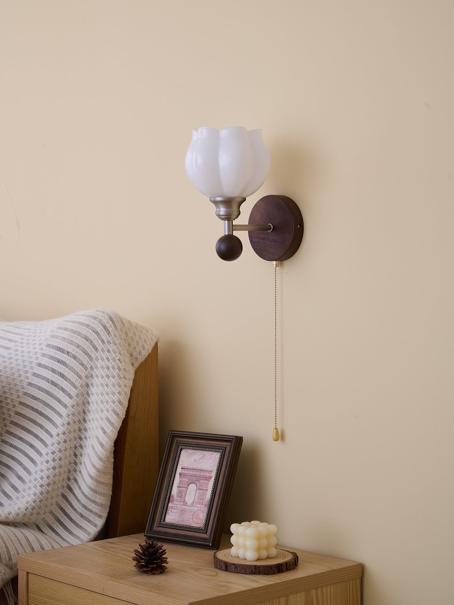 The Lucille Wall Lamp features a delicate hexagonal glass shade paired with a metal and wooden base. This combination creates a stunning piece that fits perfectly in both modern and classic interiors, offering a warm, inviting light.