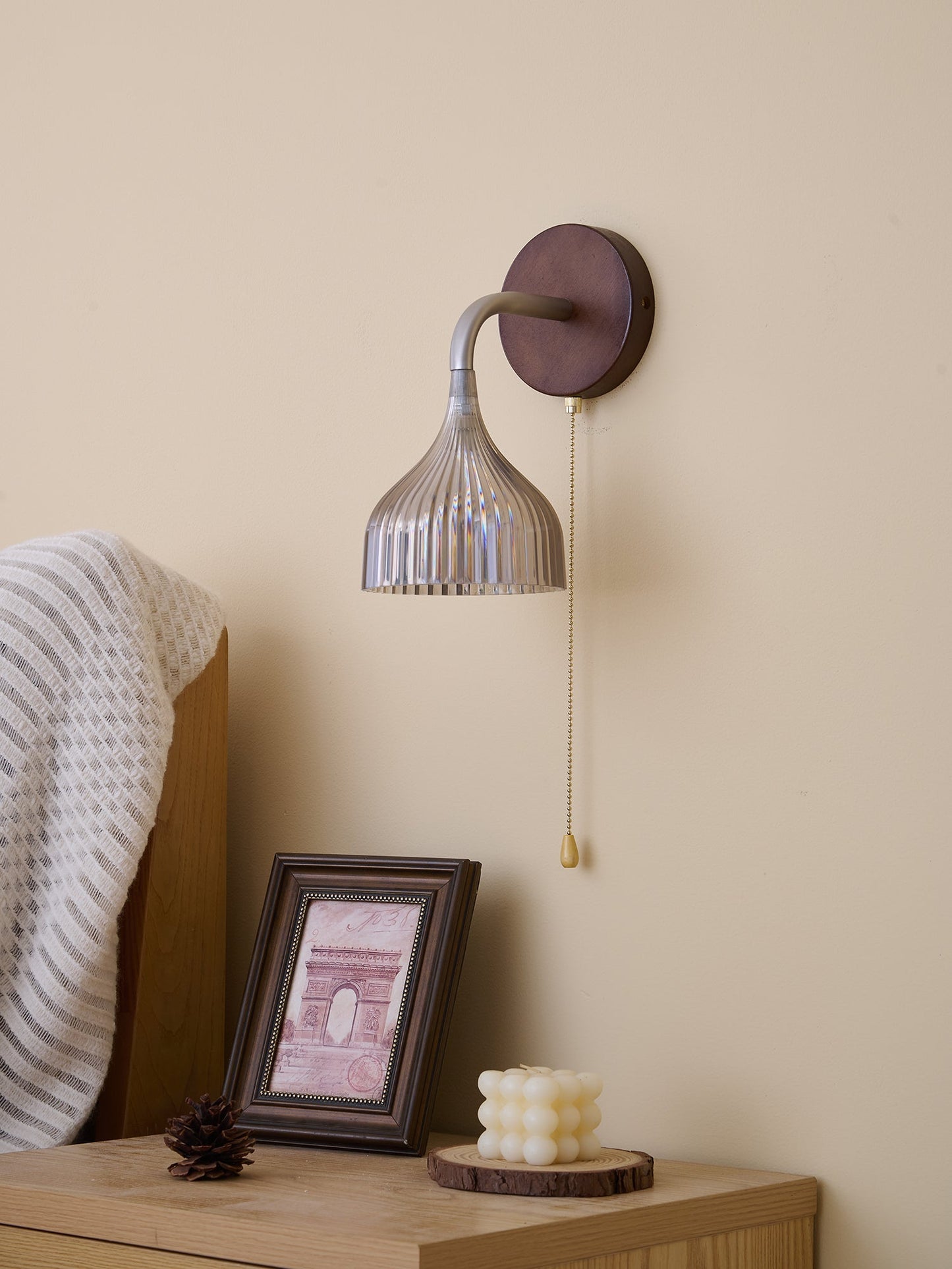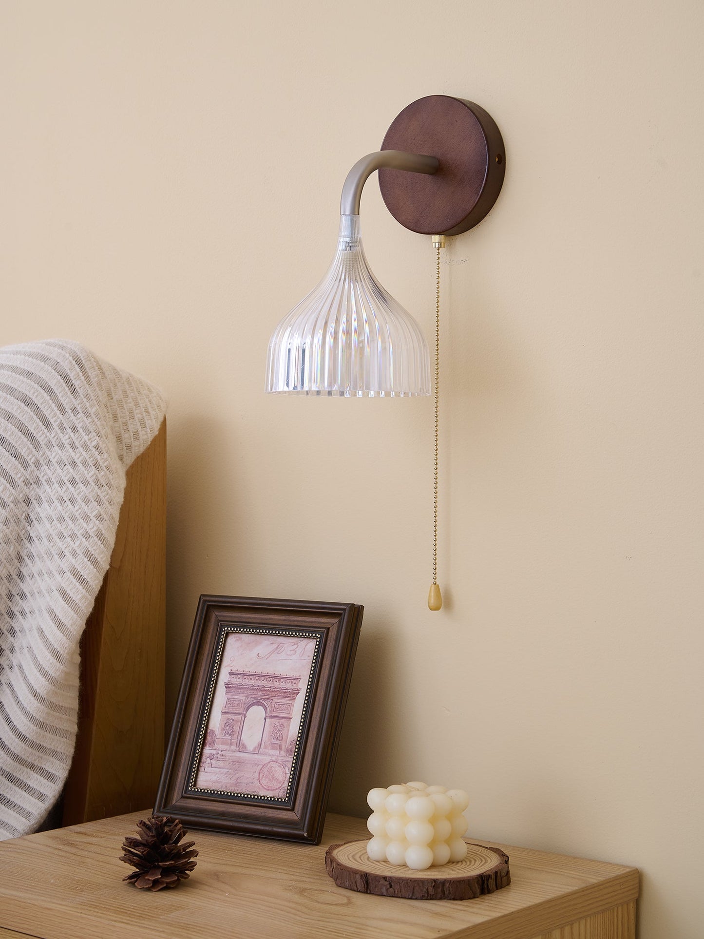 The Lucina Wall Lamp combines smooth, organic lines with sleek metal and wood accents. The elegant fluted PU shade casts a soft glow, making it a perfect addition to any modern or minimalist setting. Its vintage pull-chain switch adds a classic touch.