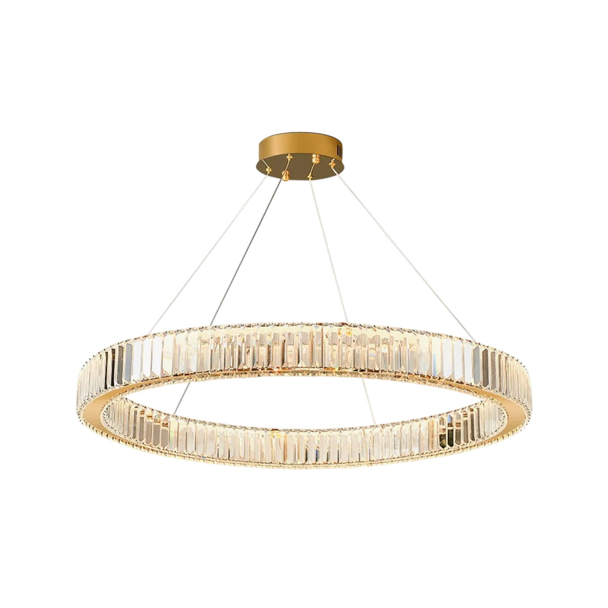 The chandelier features interlaced gold-finished rings with sparkling crystals, delivering a contemporary yet timeless design for any interior.