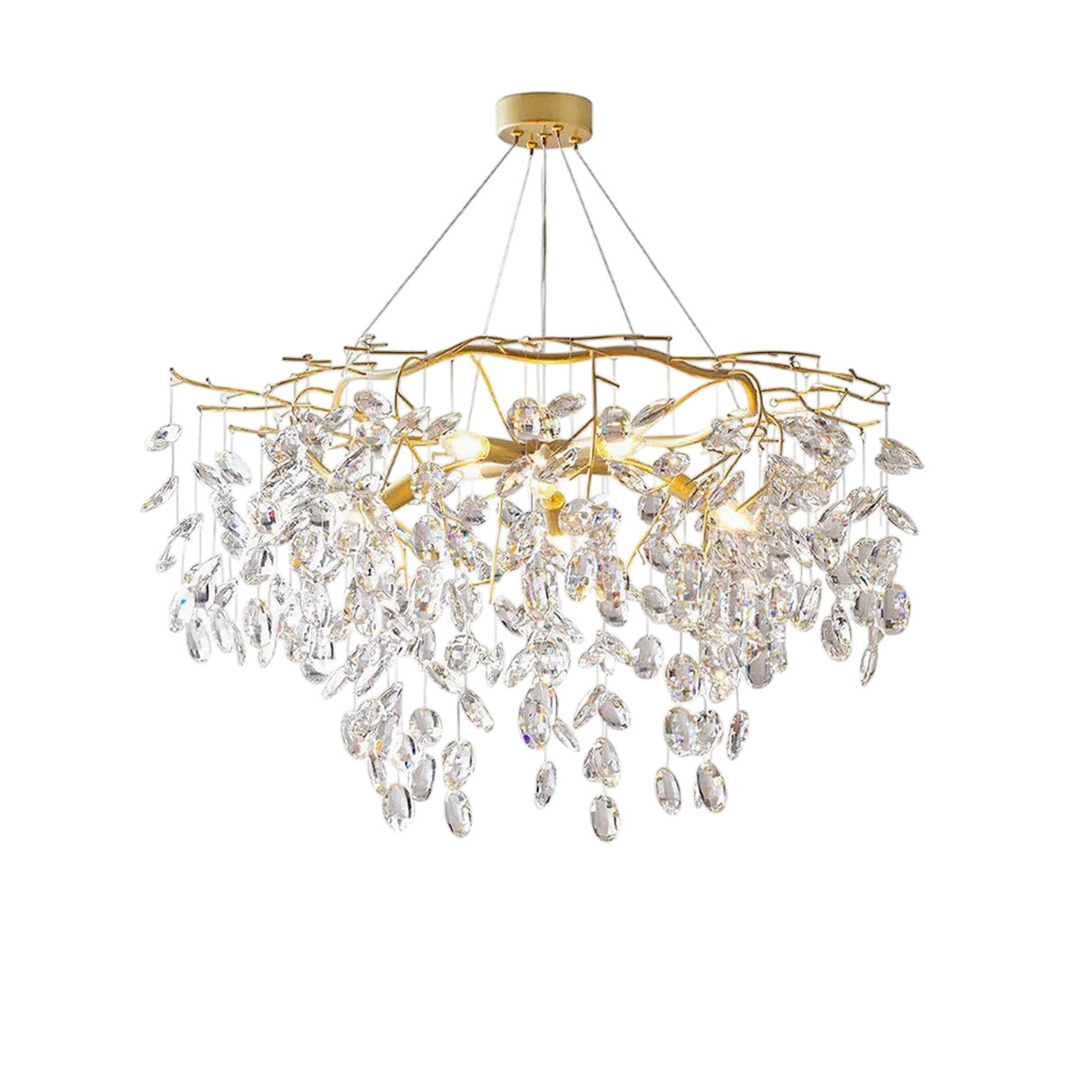 A dazzling brass and crystal chandelier that brings a burst of sparkle to any room. Its modern branch design holds LED bulbs for bright, energy-saving illumination. Perfect for living rooms, dining areas, or as a glamorous bedroom centerpiece.